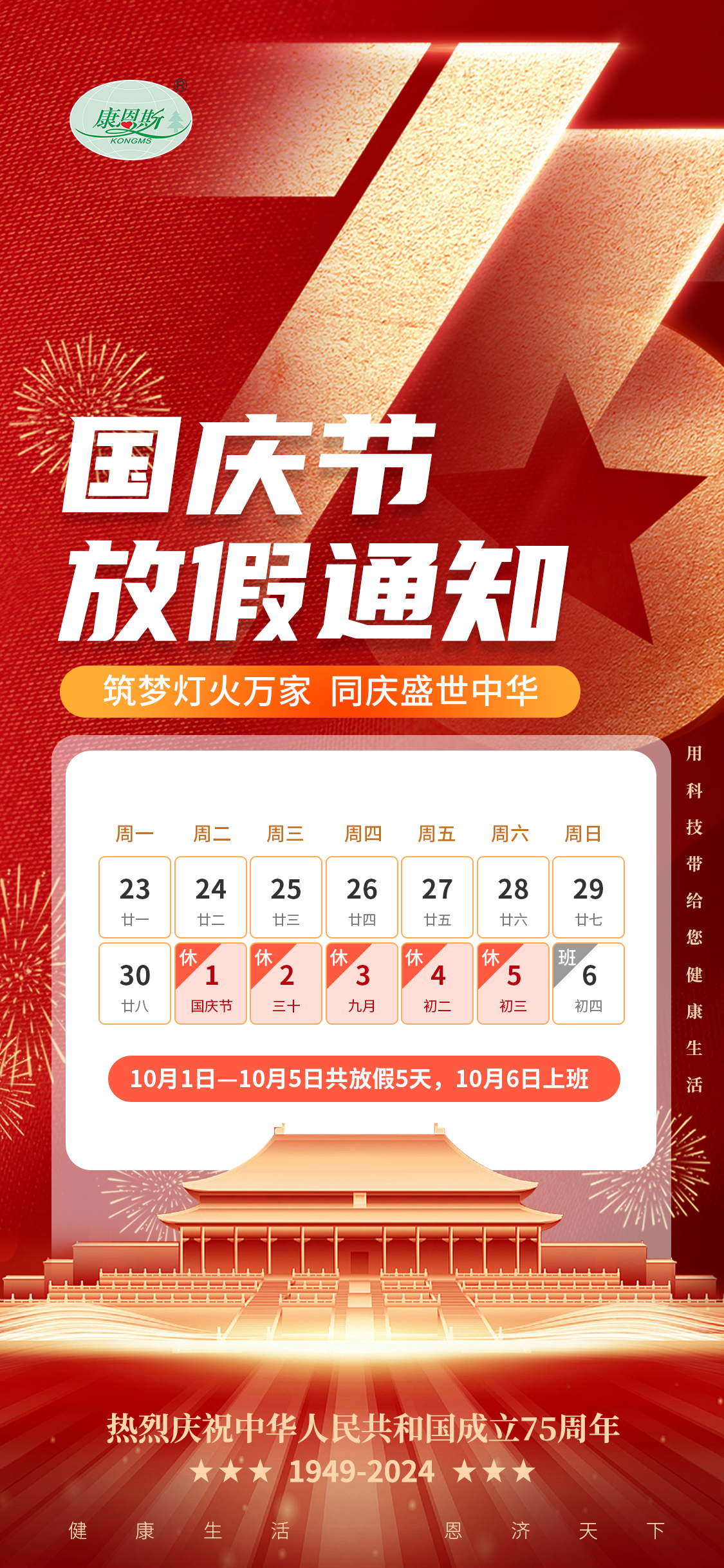 康恩斯熱烈慶祝中華人民共和國成立75周年和國慶放假通知